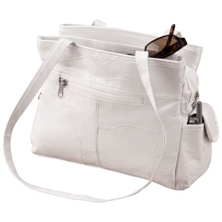 Hard-to-find white patch leather handbag gives organization a new look. Leather handbag features 3 secure interior zip pockets and 4 exterior pockets: 1 zip, 1 open, smartphone pouch and umbrella pocket. White lining makes it easy to find items. Professional clean. White leather handbag measures 8 1/2″L x 11 1/2″H x 3 3/4″W with 14″ drop.